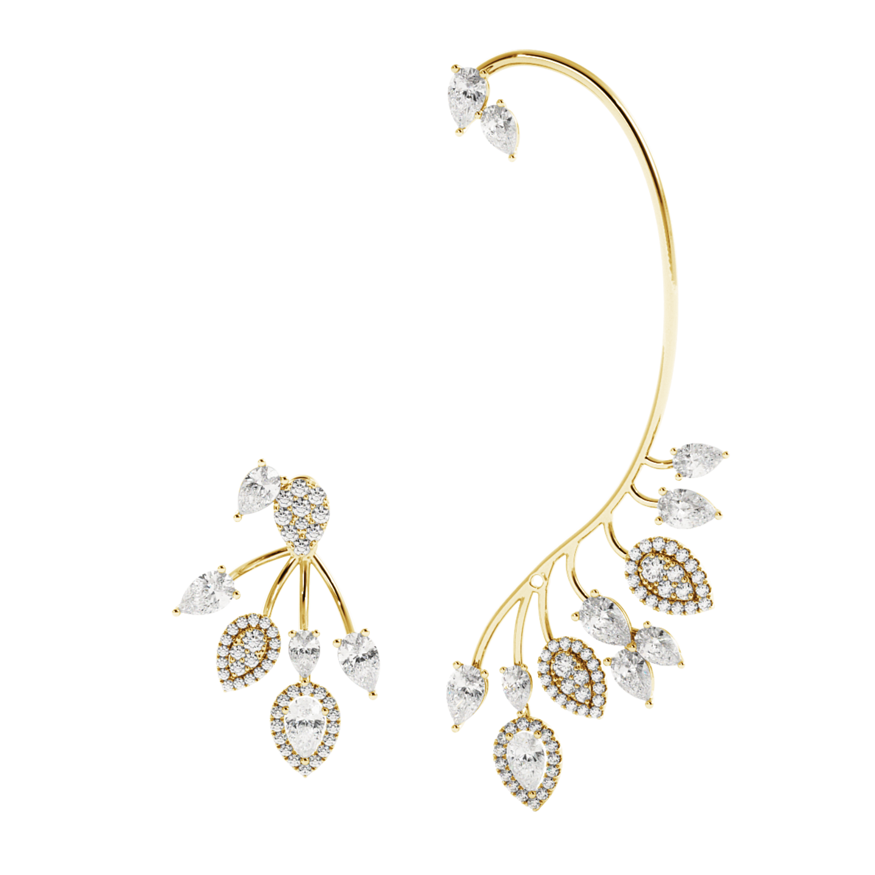 Diamond Bonanza Maxi is a stunning piece that climbs over your ear, featuring brilliant cut and pear cut white diamonds, totaling a carat weight of 2.5ct per piece. The Maxi piece is secured by attaching it to the ear using a stud. Wear the Diamond Bonanza Maxi together with the Diamond Bonanza Stud and Back Piece for a breathtaking asymmetrical look.