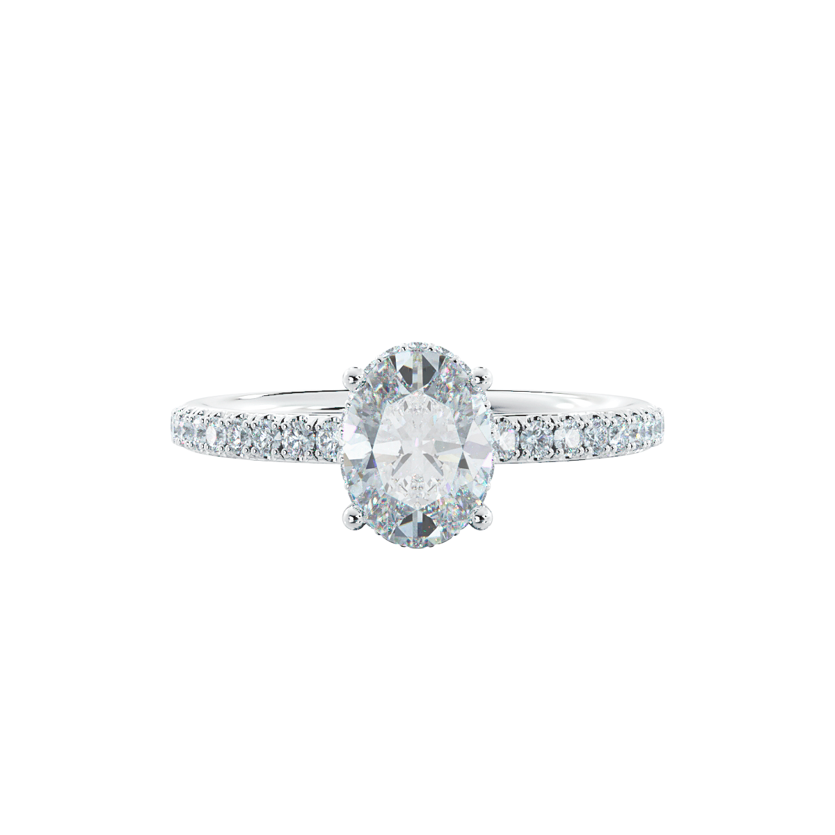 A handcrafted ring showcasing an oval cut diamond, accompanied by additional white brilliant cut diamonds along the band and in a double halo beneath the center stone. Available in half, three quarters, or fully mounted, and with a flat or round band.