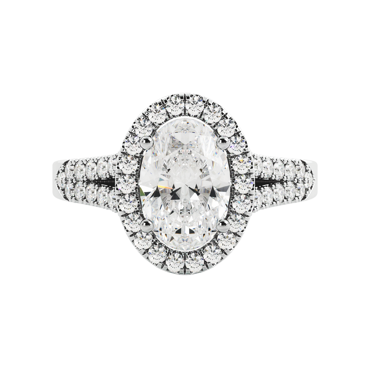 A handcrafted ring featuring an oval cut diamond, encircled by a halo of white brilliant cut diamonds and adorned with additional diamonds on the split band. Available as half, three quarters or fully mounted and with a round or flat band.