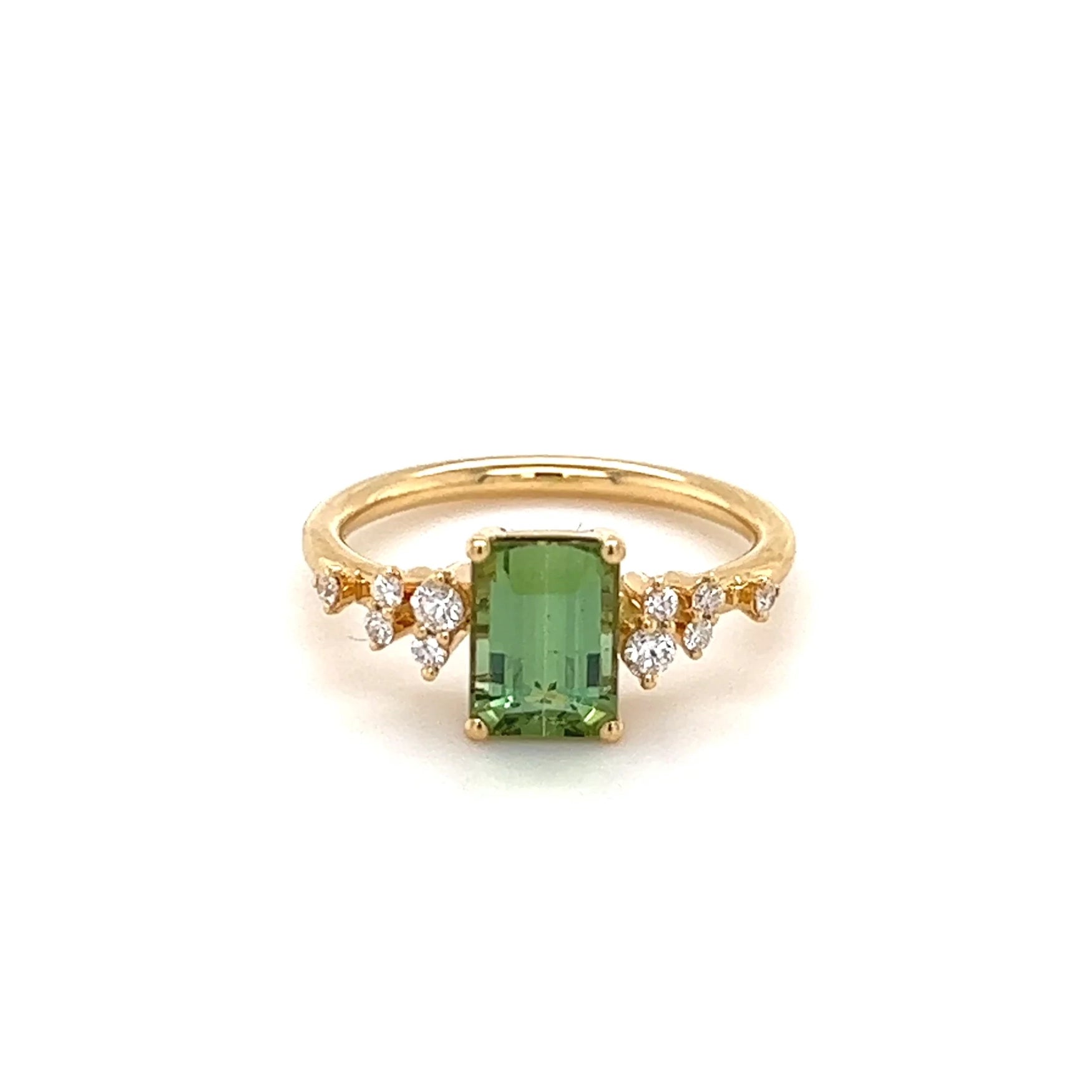 A handcrafted ring, featuring a unique cushion-cut green tourmaline as the center stone, accompanied by ten brilliant cut diamonds of varying sizes along the band, totaling 0.22 carats, adding a touch of sparkle to this elegant design.
