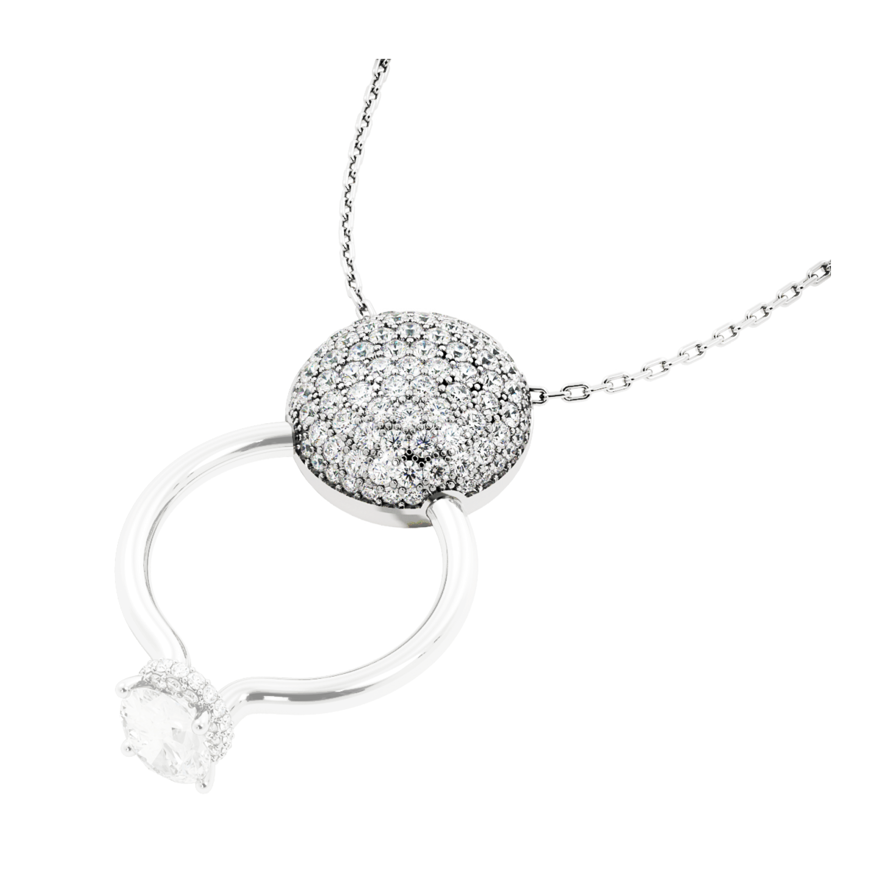 Hold My Love is a handcrafted necklace featuring a 15mm diameter round lock mechanism adorned with natural white brilliant cut diamonds, totaling 1.23ct. The piece is designed to securely hold your solitaire ring, keeping it close to you even when you're not wearing it on your finger.