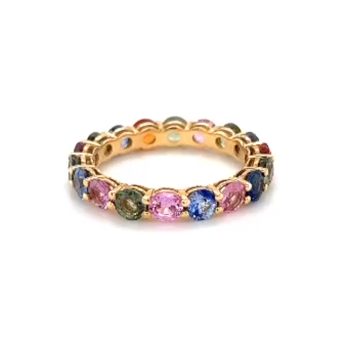 This handmade eternity ring showcases 0.20–0.25ct brilliant cut sapphires in a spectrum of colors, providing a design that is both sophisticated and playful. Every ring is unique as no two sapphires are identical.