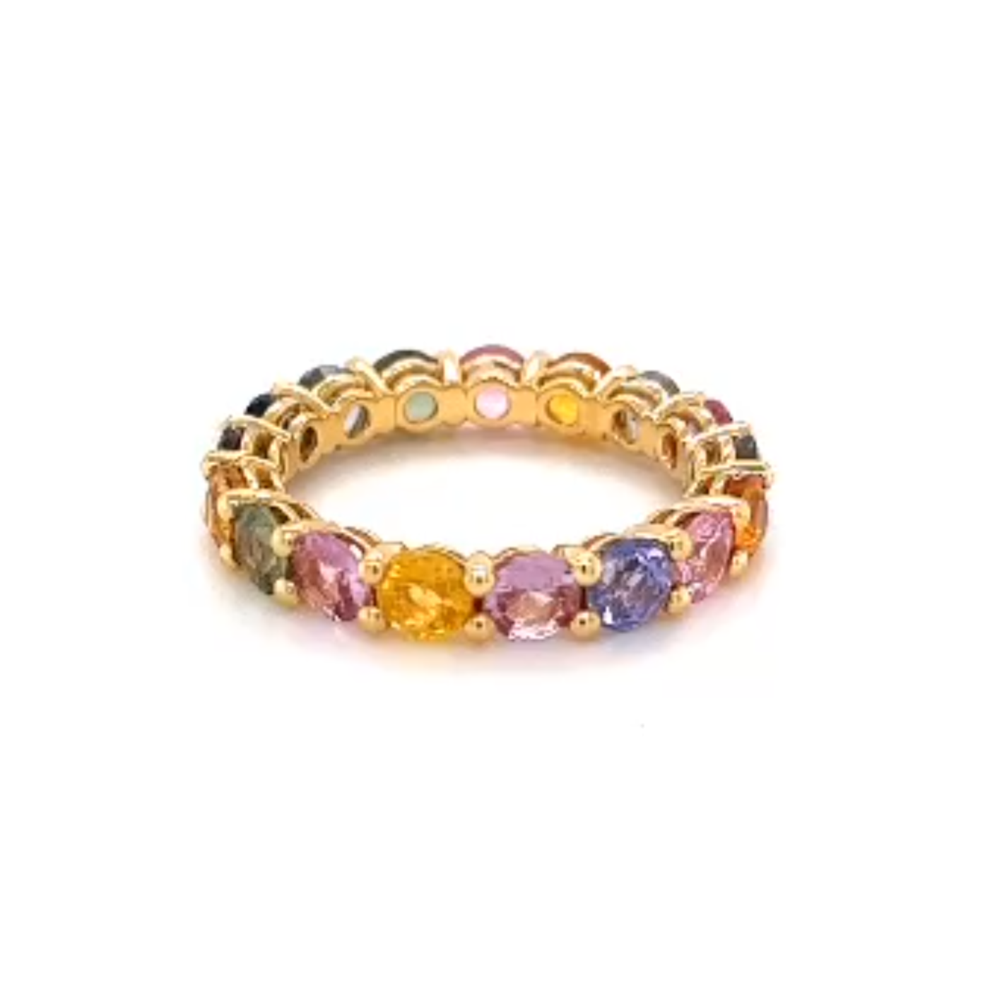 This handmade eternity ring showcases 0.20–0.25ct brilliant cut sapphires in a spectrum of colors, providing a design that is both sophisticated and playful. Every ring is unique as no two sapphires are identical.