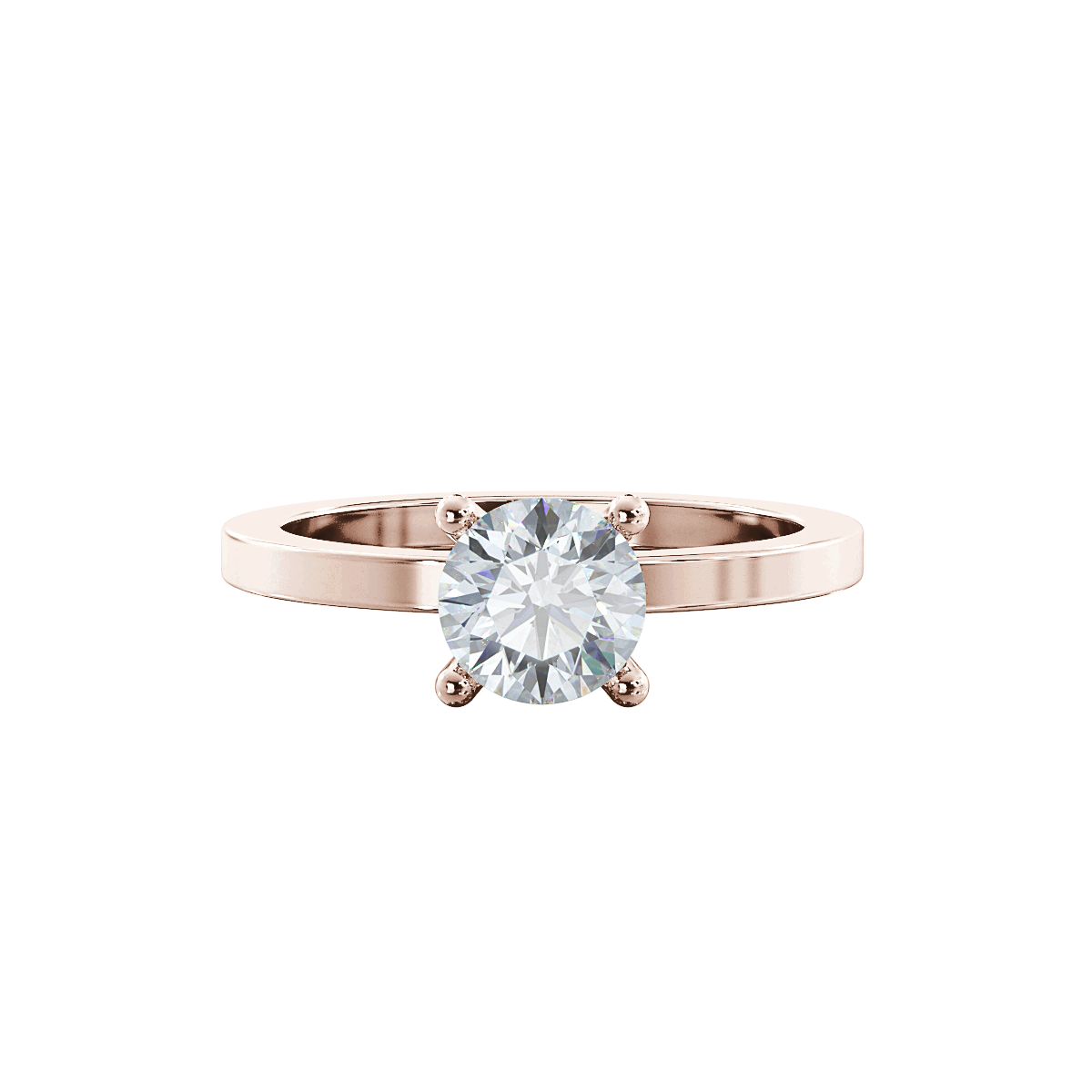 A handcrafted ring showcasing a brilliant cut diamond set in four prongs. Available with a flat or round band.