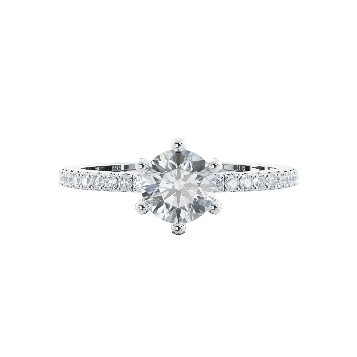 A handcrafted ring showcasing a brilliant cut diamond set in four prongs, accompanied by additional white diamonds along the band and on the prongs. Available as half, three quarters, or fully mounted, and with a flat or round band.