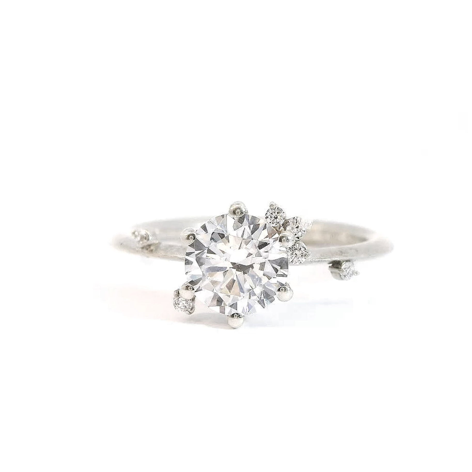 A handcrafted ring featuring a unique brilliant cut white diamond set in six delicate prongs, accompanied by six brilliant cut diamonds of varying sizes along the band, totaling 0.10 carats, adding a touch of sparkle to this elegant design.