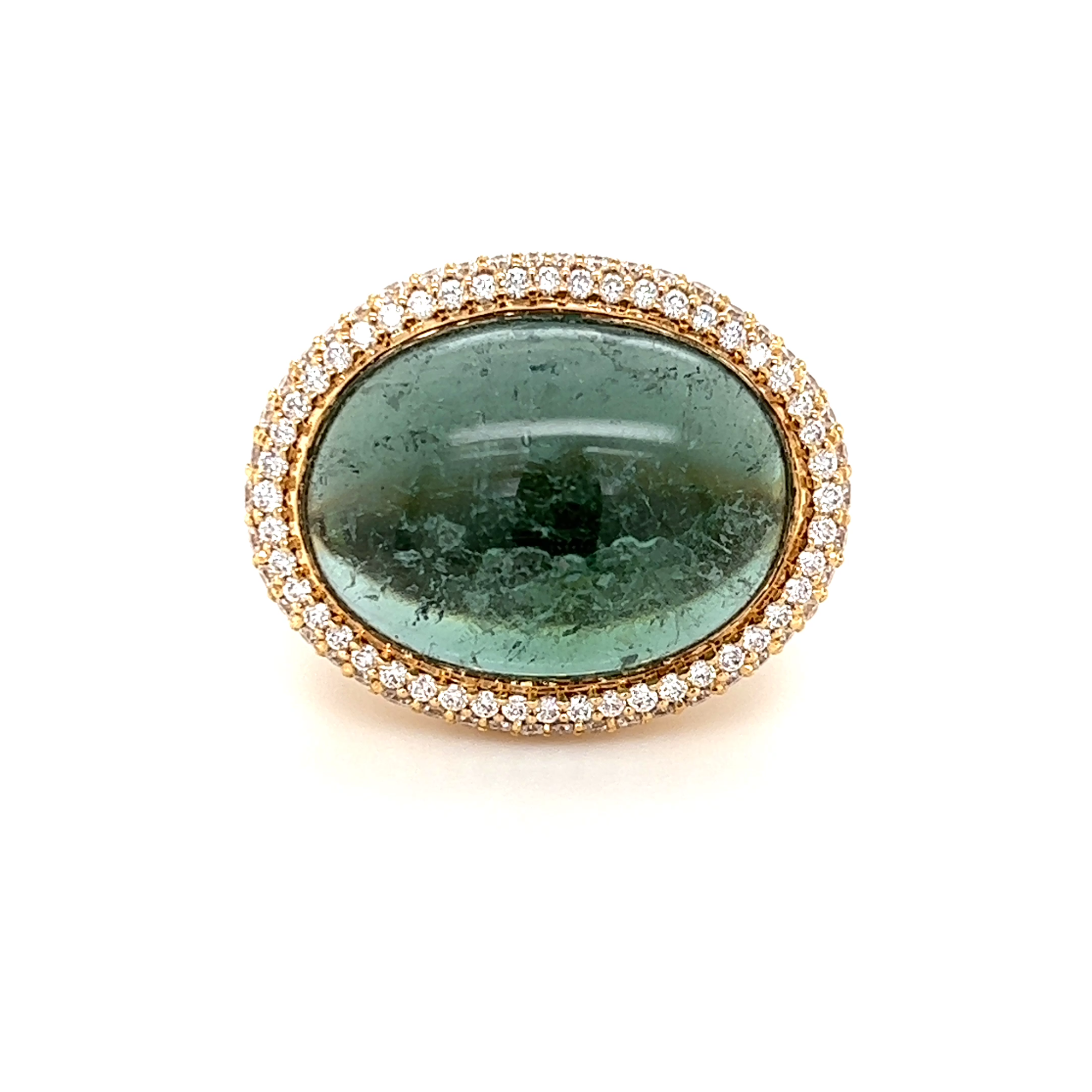 Pinky Ring Pavé is a beautiful addition to your jewelry collection featuring a stunning Green Tourmaline and brilliant cut white diamonds around the center stone and on the band, totaling approximately 3.11ct. No ring is the same as another, as all center stones are unique.