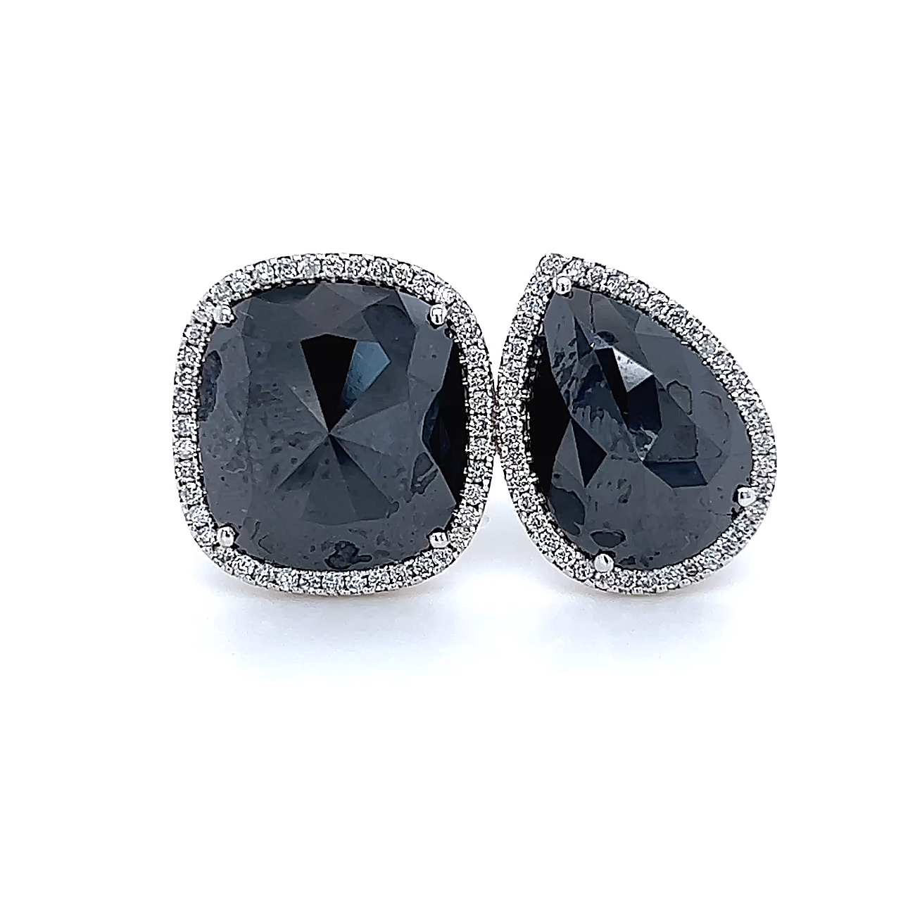 A handcrafted two-stone ring, featuring a striking 10.8-carat cushion-cut black diamond and a 9.8-carat pear-cut black diamond.