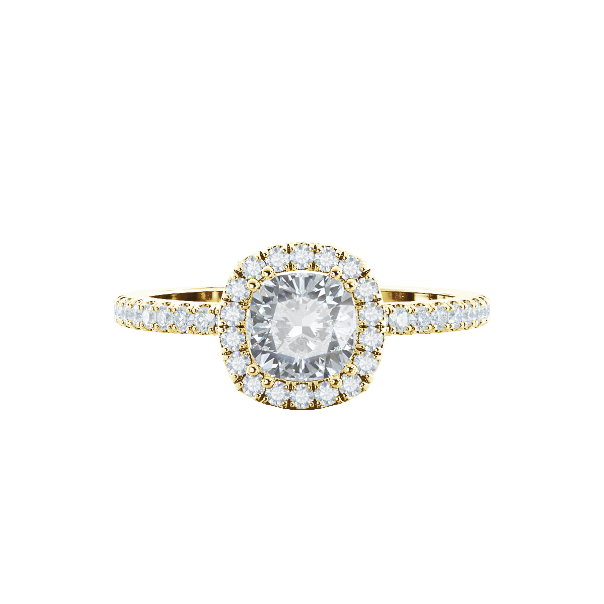 A handcrafted ring featuring a cushion cut diamond, encircled by a halo of white brilliant cut diamonds and adorned with additional brilliant cut diamonds along the band. Available as half, three quarters or fully mounted and with a flat or round band.