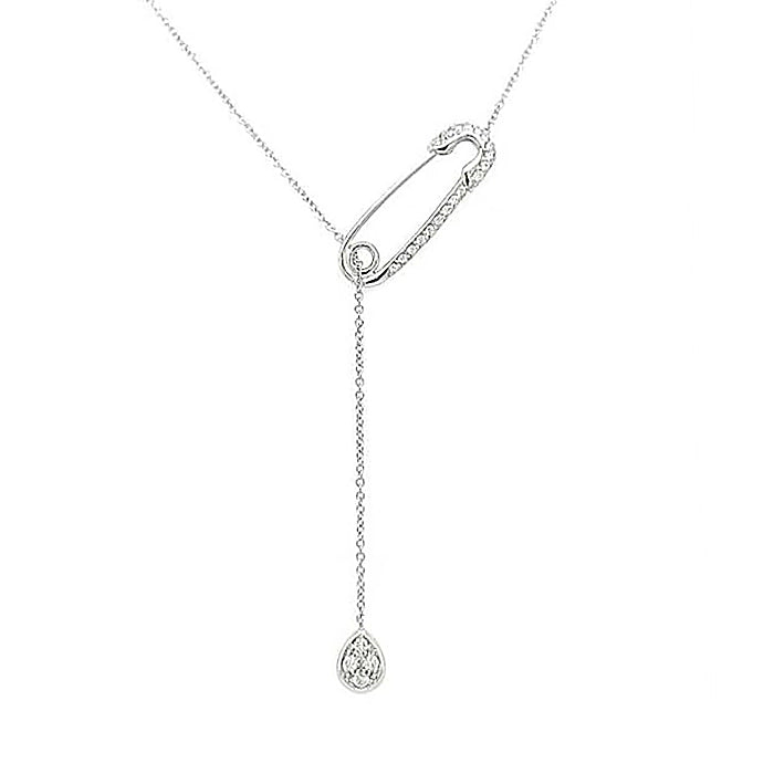 Safety Pin Necklace is a handcrafted piece embellished with 0.48ct of white brilliant cut diamonds. The necklace can be adjusted by moving the drop shape up or down, allowing you to customize its appearance to suit your style.