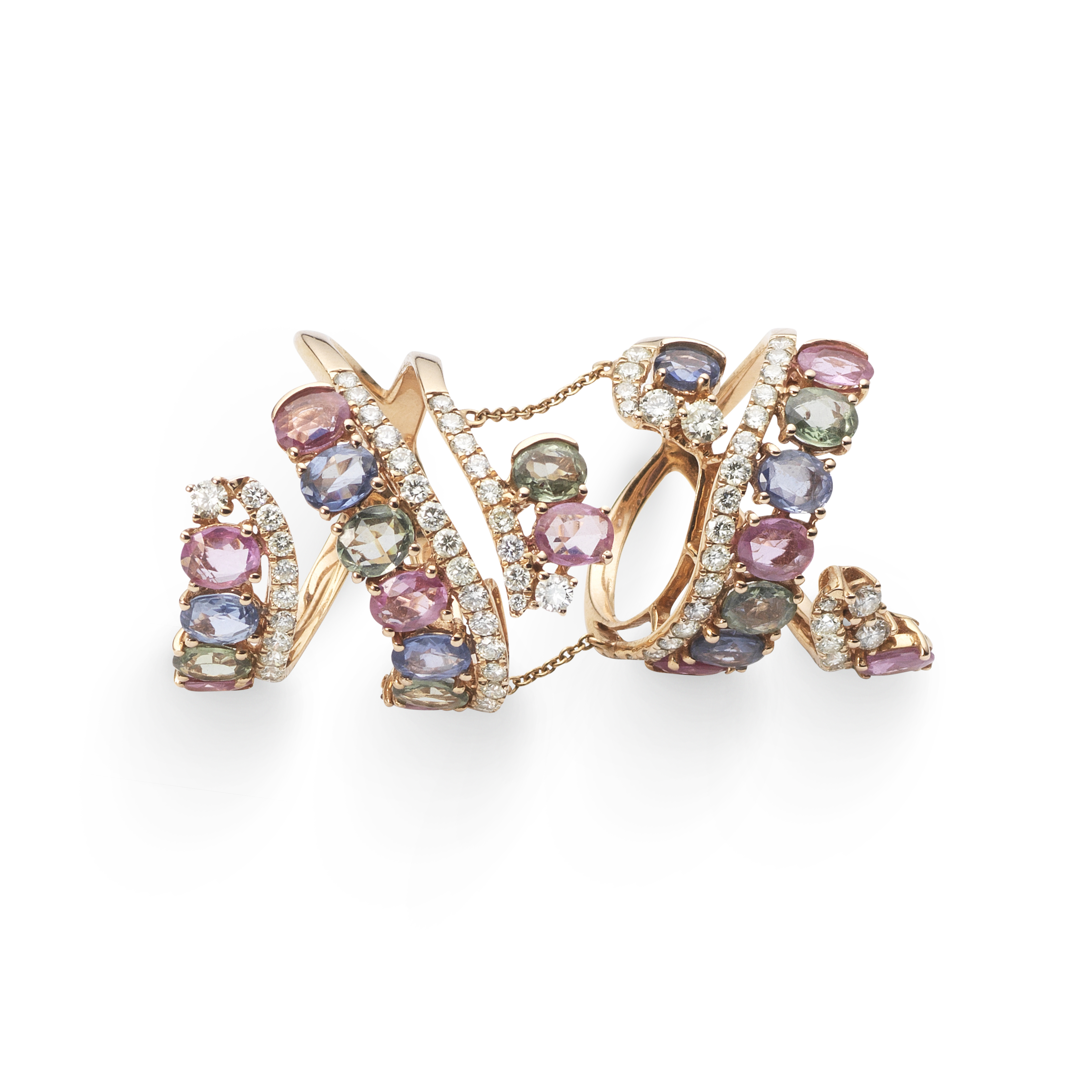 The diamonds and sapphires effortlessly climb up your finger in an intricate setting made of 18k gold. A supple mechanism allows your finger to move and bend without restraint, even though the ring covers your finger completely.