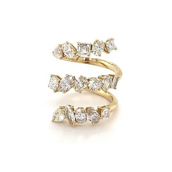Swirl is a handcrafted and unique ring with pear cut, asscher cut, brilliant cut, oval cut and marquise cut white diamonds totaling approximately 2.5ct that swirls around your finger.