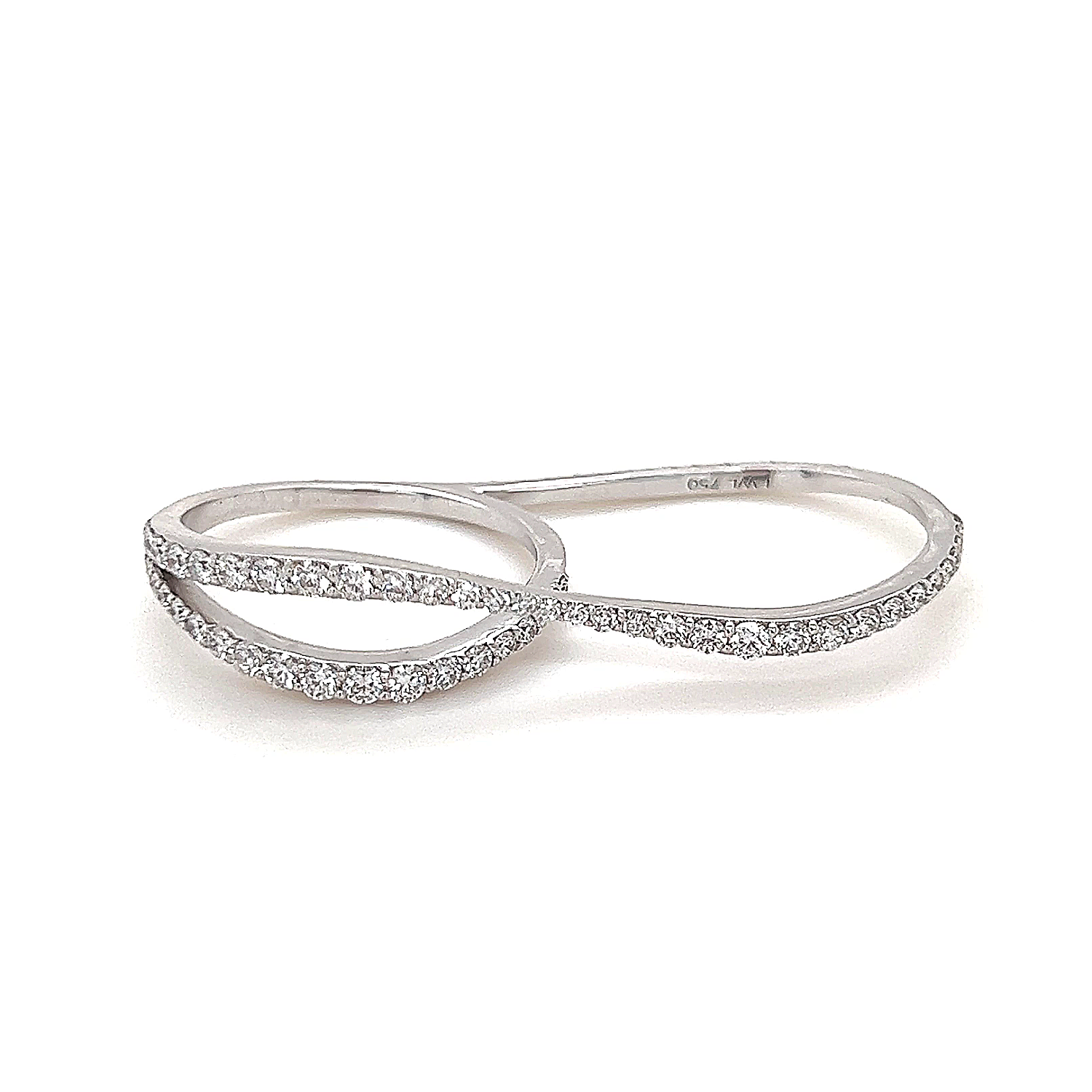 Wave is a stylish ring that spans over two fingers with a total of approximately 1.03ct of white brilliant cut diamonds. This ring is a statement piece in itself but pairs beautifully with other eternity bands as well.
