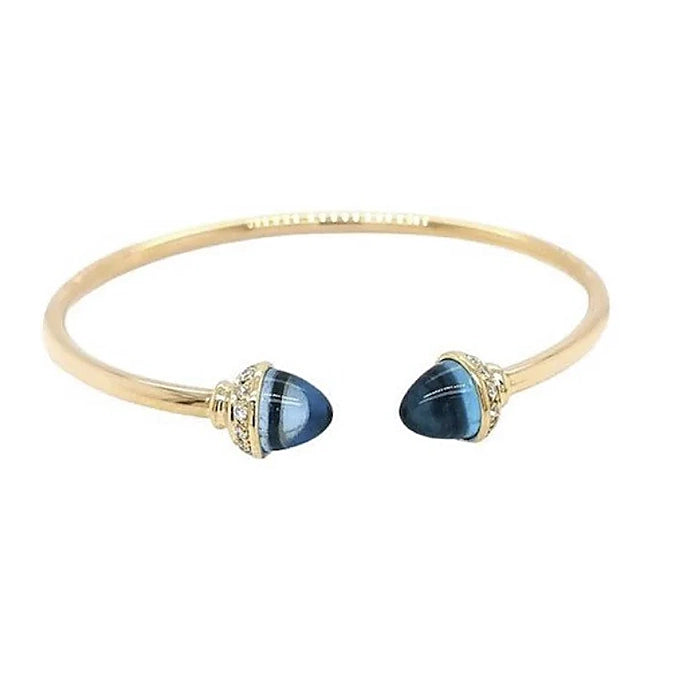 Elastic Bangle is a handcrafted bangle in 18k elastic gold with 0.33ct of brilliant cut white diamonds around two cabochon cut Swiss Blue Topazes, totaling 7.88ct.