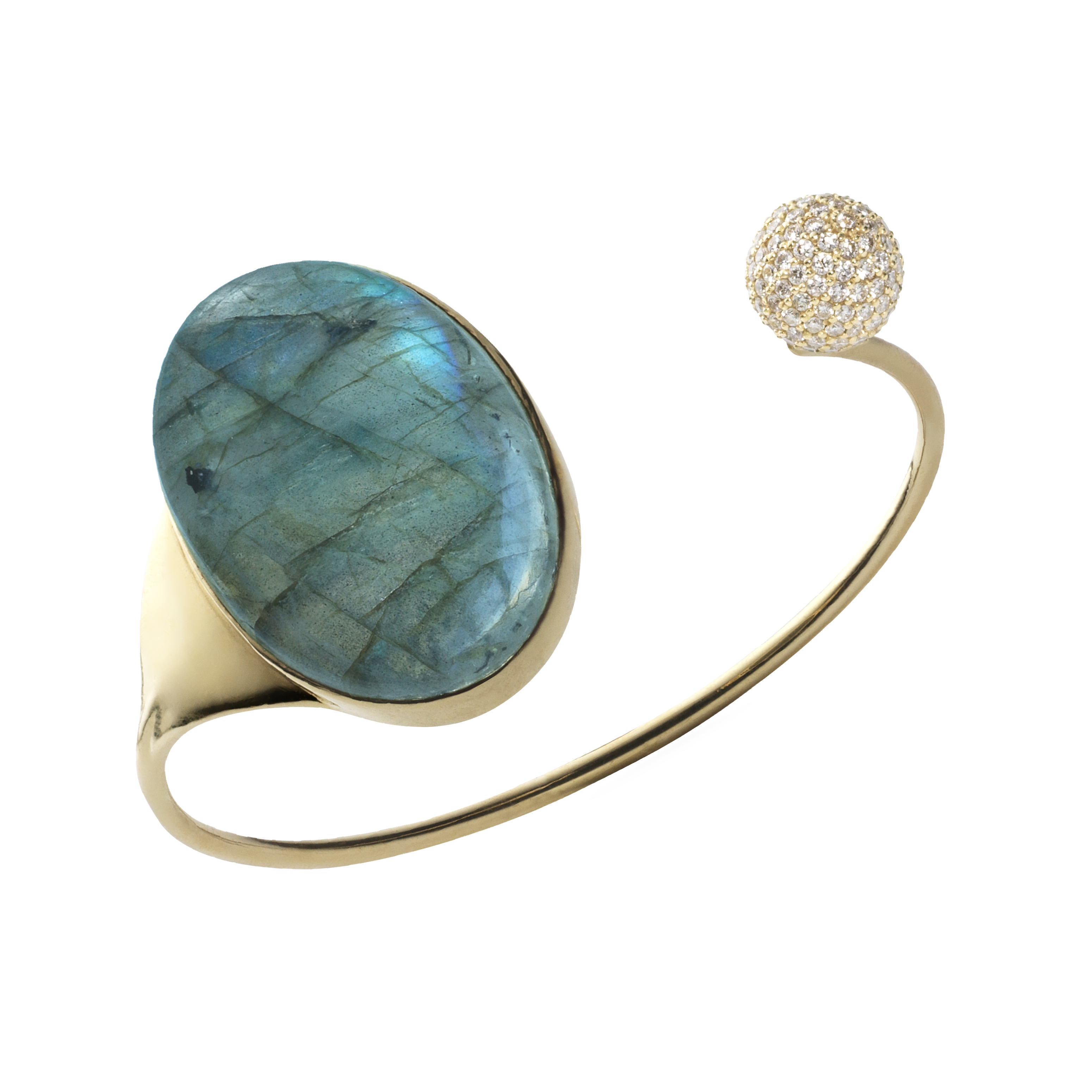 Floating Labradorite is a stunning piece of jewelry that you can wear every day, featuring a labradorite and a diamond ball with brilliant cut white diamonds totaling 1ct.