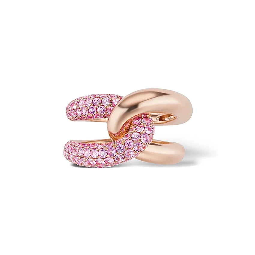 Click features two interconnected ring parts forming a beautiful knot, allowing you to mix and match different elements to suit various occasions and outfits. This particular combination includes one part adorned with brilliant cut natural pink sapphires and another with brilliant cut white diamonds, sold separately or together. Two parts are required to form a ring.