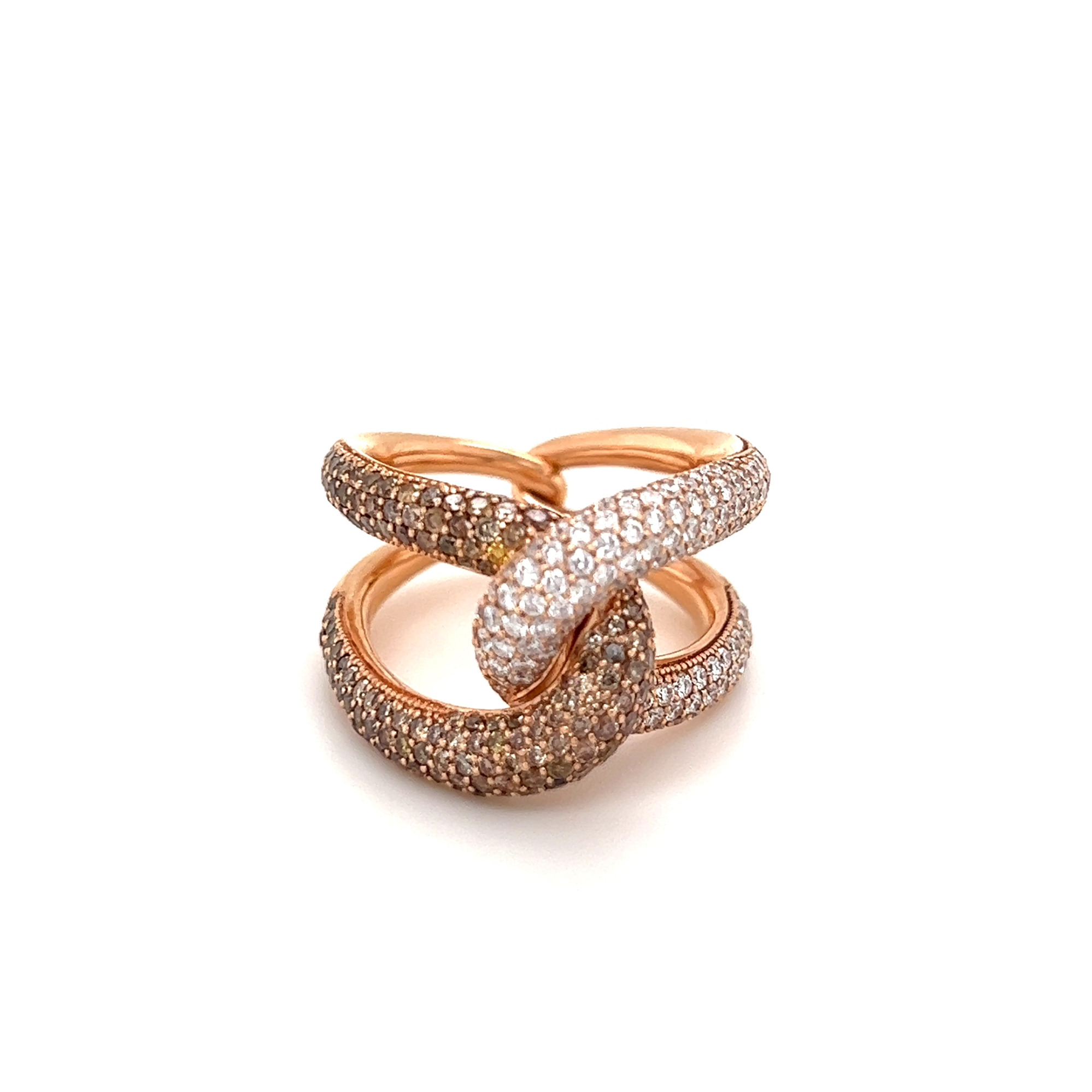 Click features two interconnected ring parts forming a beautiful knot, allowing you to mix and match different elements to suit various occasions and outfits. This particular combination includes one part adorned with brilliant cut brown diamonds and one with brilliant cut white diamonds, sold separately or together. Two parts are required to form the ring.