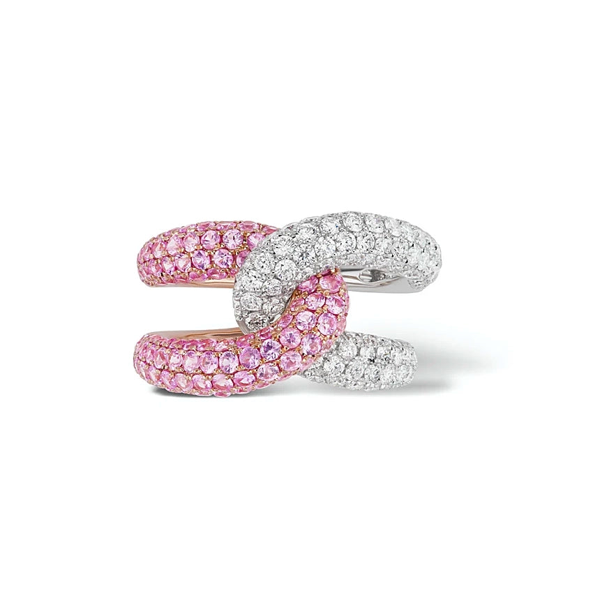 Click features two interconnected ring parts forming a beautiful knot, allowing you to mix and match different elements to suit various occasions and outfits. This particular combination includes one part adorned with brilliant cut natural pink sapphires and another with brilliant cut white diamonds, sold separately or together. Two parts are required to form a ring.