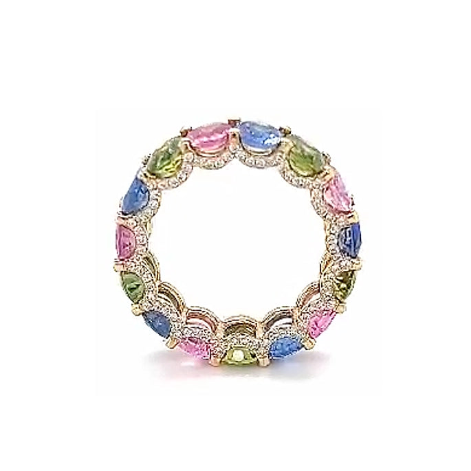 You and Me is a handcrafted eternity ring featuring oval cut natural colored sapphires and tourmalines, each weighing 0.40–0.50ct, set in an elegant pavé band with brilliant cut diamonds. This ring, with its unique color shifts and glistening diamonds, symbolizes love and affection, making it both sophisticated and uniquely enchanting.