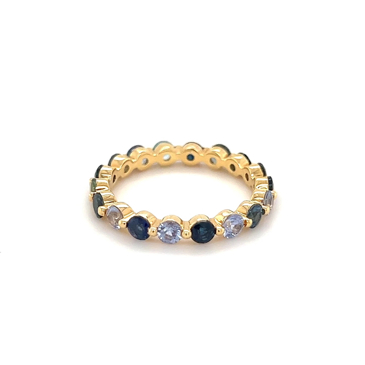 A handcrafted eternity ring featuring 0.15–0.18ct brilliant cut sapphires in a variety of colors, elegantly set in a refined one-prong setting that highlights the full beauty of each stone.