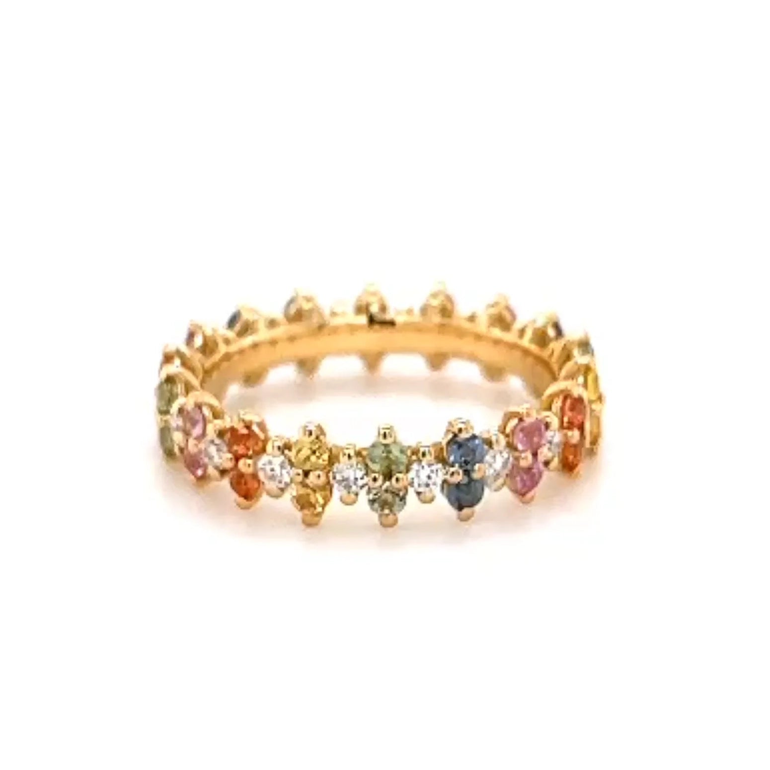 Clover Rainbow is a stunning eternity band designed to dazzle, featuring 0.028—0.030ct brilliant cut diamonds and brilliant cut sapphires in a variety of colors set in an intricate pattern. This ring is a striking statement piece on its own and pairs elegantly with other eternity bands. Every ring is unique as all gemstones are natural and one of a kind.
