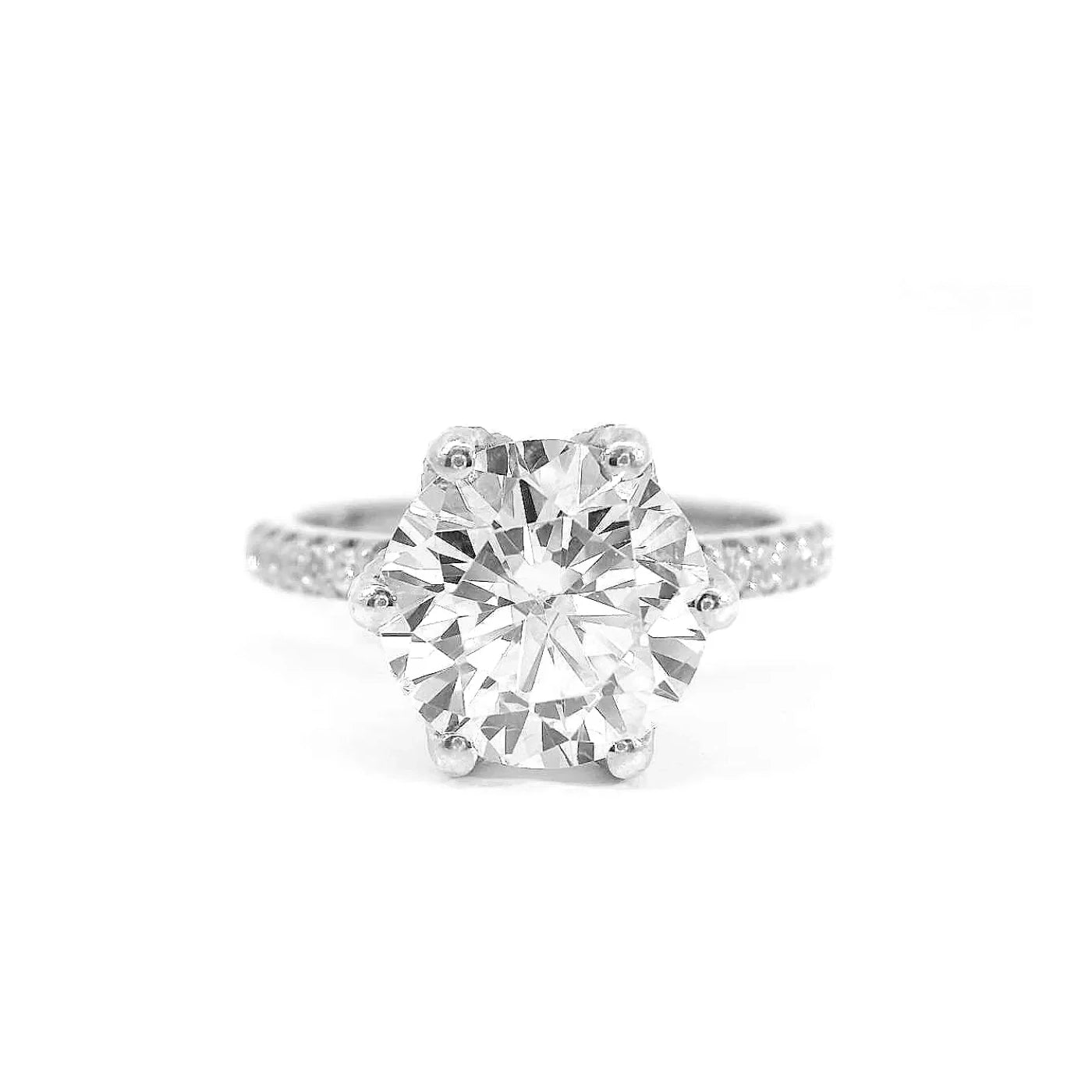 A handcrafted ring showcasing a brilliant cut diamond, accompanied by additional white diamonds along the band and on the six prongs.