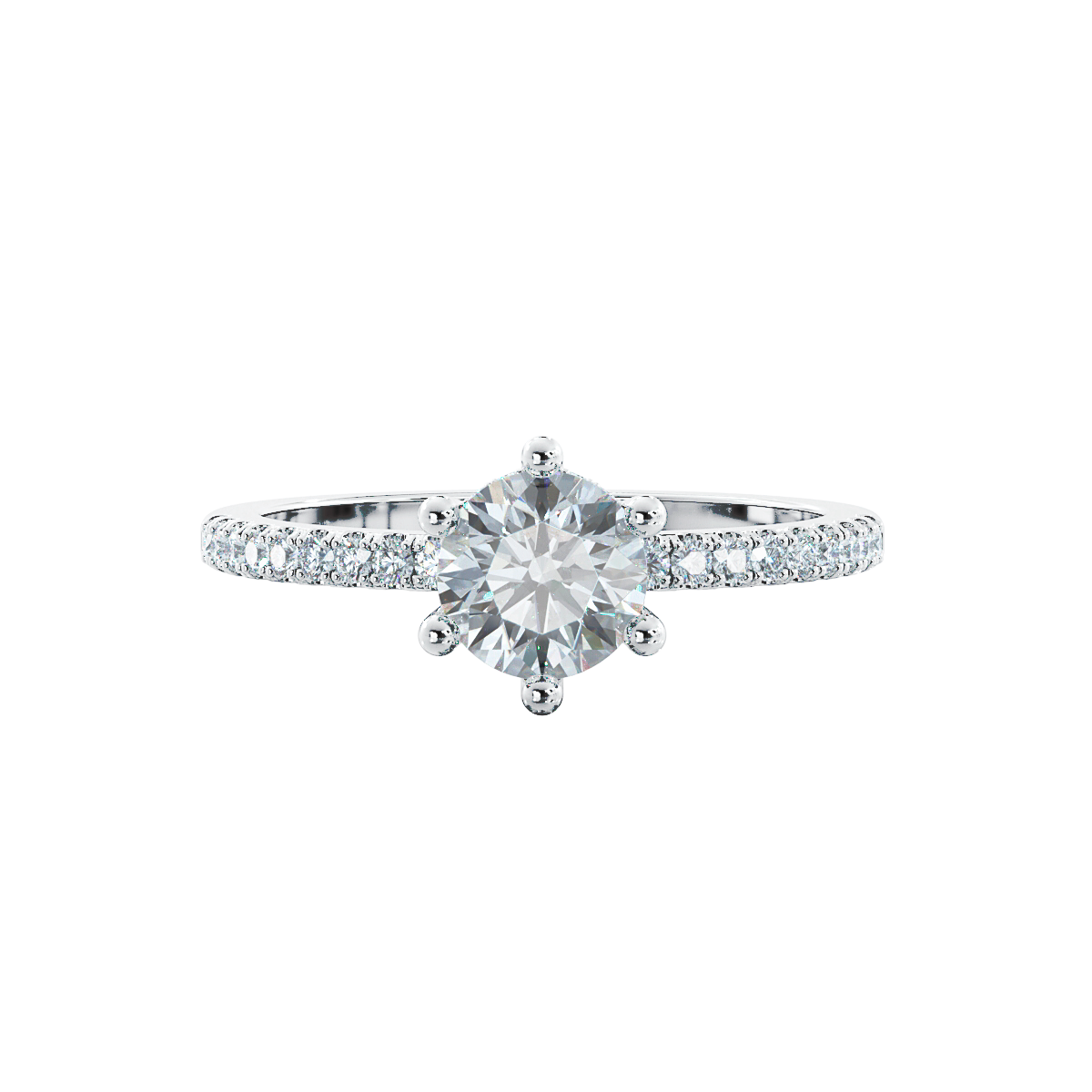 A handcrafted ring showcasing a brilliant cut diamond, accompanied by additional white diamonds along the band and in a hidden basket below the center stone. Available in half, three quarters, or fully mounted, and with a flat or round band.
