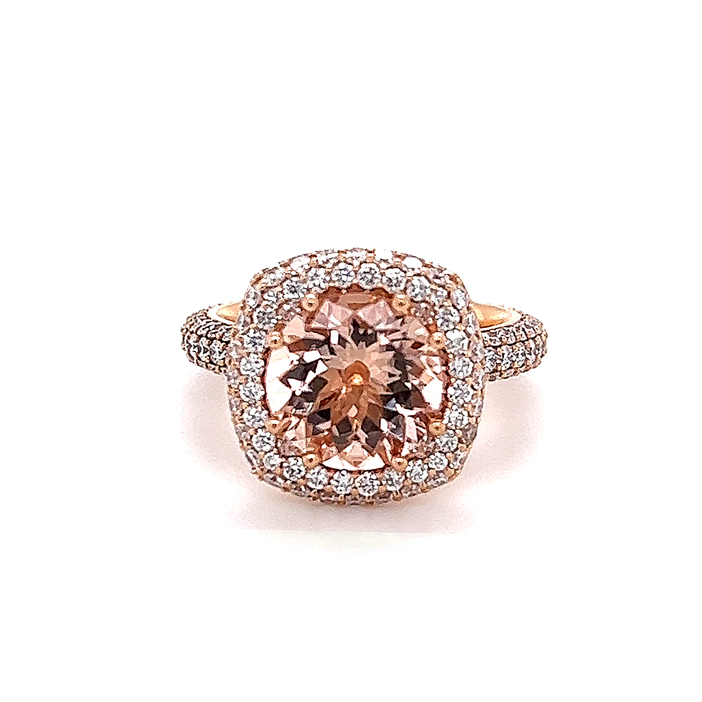 A handcrafted cocktail ring featuring a stunning Pink Morganite center stone encircled by three rows of brilliant cut white diamonds, with additional diamonds along the band, totaling approximately 2.46 carats. Each cocktail ring is unique, as no two center stones are alike.