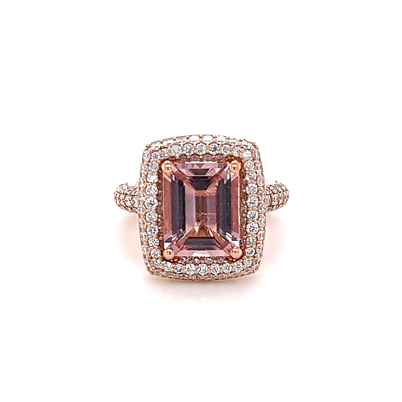 A handcrafted cocktail ring featuring a stunning, radiant cut Morganite center stone and three rows of white brilliant cut diamonds on the band and in a halo around the center stone, totaling approximately 2.46ct. Each cocktail ring is unique, as no two center stones are alike.