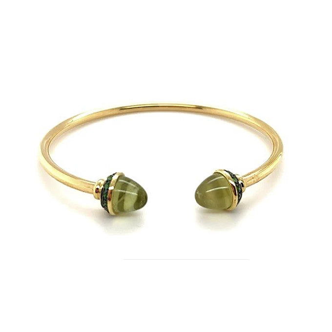 Elastic Bangle is a handcrafted bangle in 18k elastic gold with 0.33ct of brilliant cut black diamonds around two cabochon cut Green Tzavorites, totaling 6.77ct.