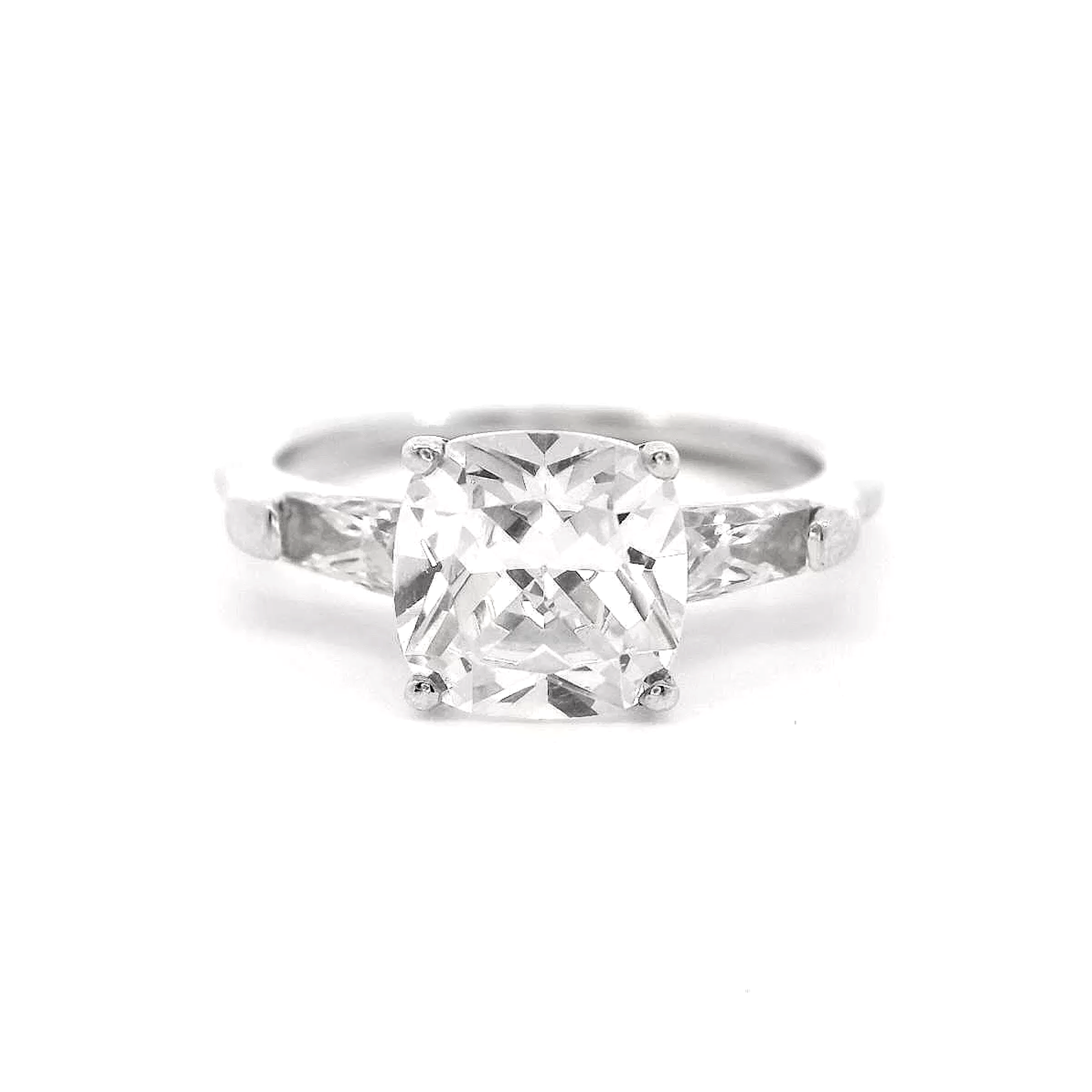 A handcrafted ring featuring one cushion cut diamond and two baguette cut diamonds. Available with a flat or round band.