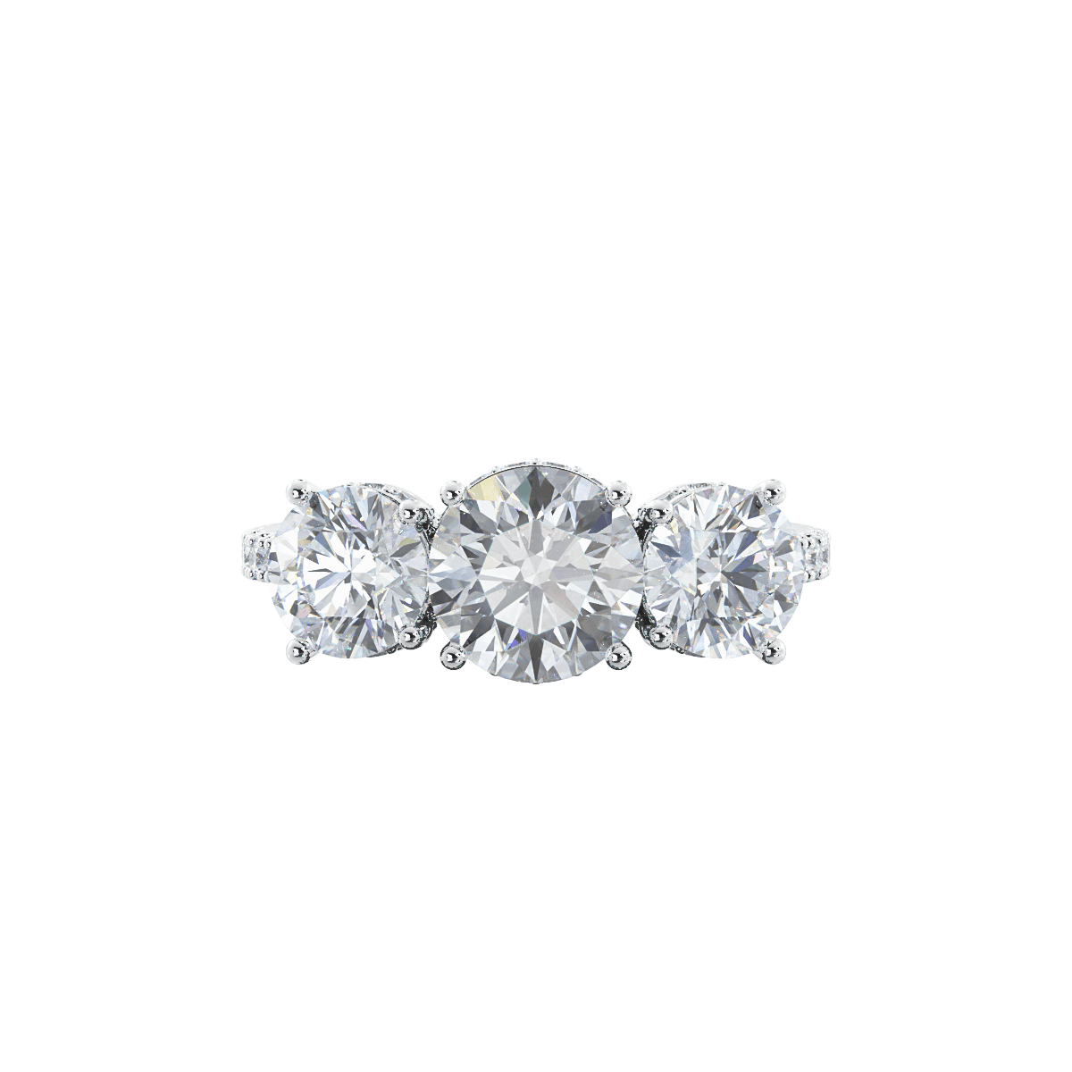 A handcrafted ring featuring three brilliant cut diamonds, each set in a hidden diamond basket, with additional white diamonds on the band. Available in half, three quarters, or fully mounted, and with a flat or round band.